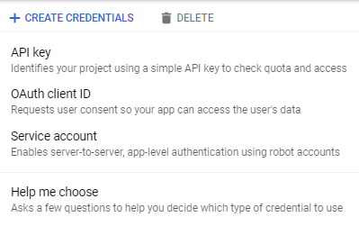 Click Create Credentials and choose Service Account Key to create credentials for the service account authentication:
