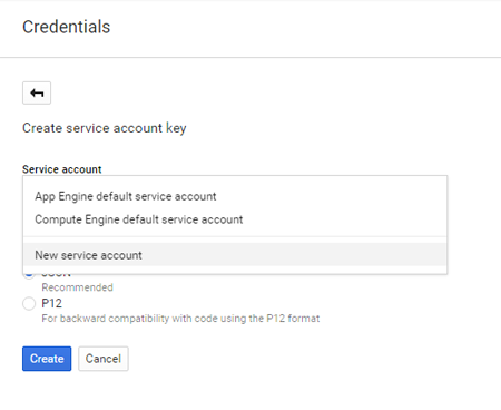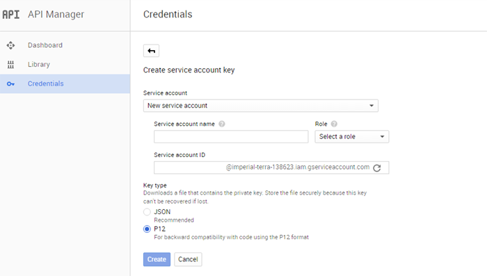 Enter the Service Account Name. This is appended in the Service Account ID box. Select the P12 Key Type and click Create.