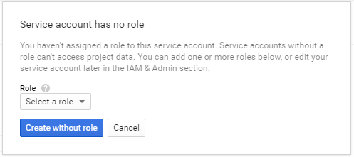 A Service Account Has No Role prompt is displayed. You may opt to select a role or add one or more later in the IAM & Admin section.