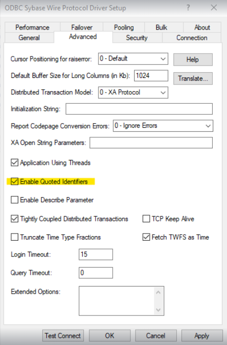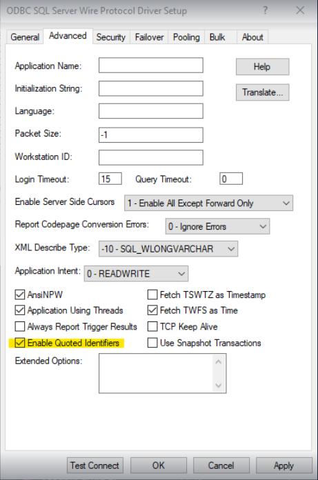 • Enable "Enable Quoted Identifiers" in ODBC settings: