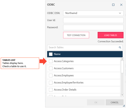 Loads the tables of the Data Source. Tables are displayed on the Tables list. |