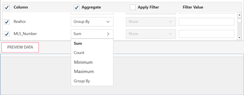 If the data returned are to be aggregated, check the Aggregate box on the header, then select the aggregation method you want to use for each column. The following aggregation methods are possible for each data type: