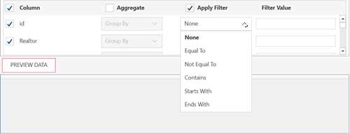 If the data returned are to be filtered, check the Apply Filter on the header. Then, for each column, select a filter method from the filter drop down and then enter the filter value in the Filter Value box. Note that some data sources require case-sensitive filter values. Refer to this list to check which data sources have case-sensitive filters. To load tables and views using an SQL Query, select the Query tab |