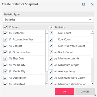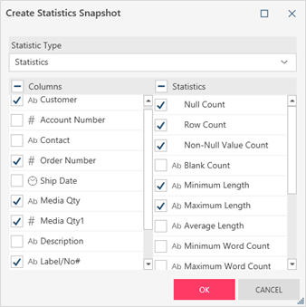 The left-hand column of the Create Statistics Snapshot dialog displays a list of all of the columns in your table for which you can create a statistics table while the right-hand column displays the various statistics you can include.