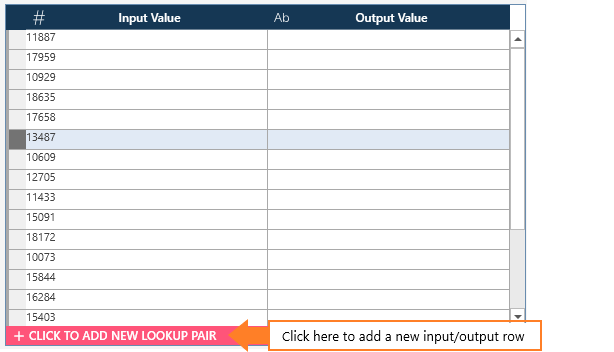 If you do not want to import input values, or if the input values are incomplete, enter the lookup pairs manually. To do so, select + Click to Add a New Lookup Pair at the bottom of the lookup table.