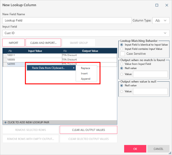 If you want to import the Input Field values from a column in the table, select the column from the Input Field drop-down, and then select one of the following buttons:
