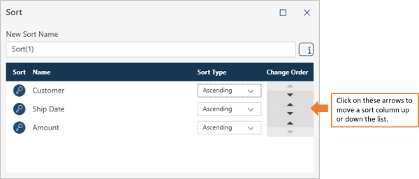 Monarch Data Prep Studio sorts according to the arrangement of sort columns. You can change the order by clicking on the up/down arrows beside a sort column.