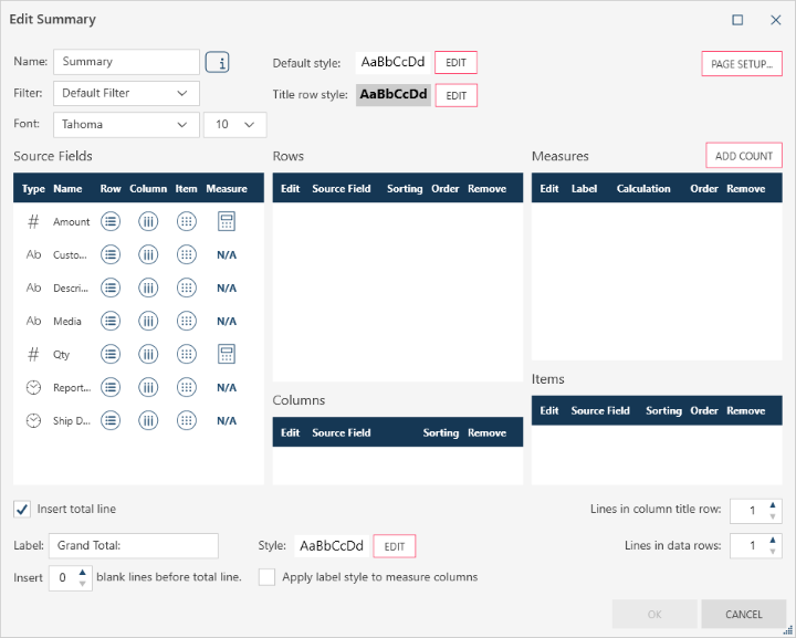 In the Lines in data rows field, set the default height for the data rows of your summary. You may set the height from 1-12 lines.