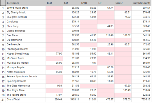 In this case, 6 records were found for Betty's Music Store selling CDs, 2 records were found for the same store selling DVDs, 1 record was found for LP sales, etc.