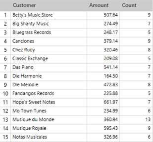 In the example above, 9 unique records were found for Betty's Music Store in the original table. Seven unique records were found for Big Shanty Music, 5 were found for Bluegrass Records, etc.