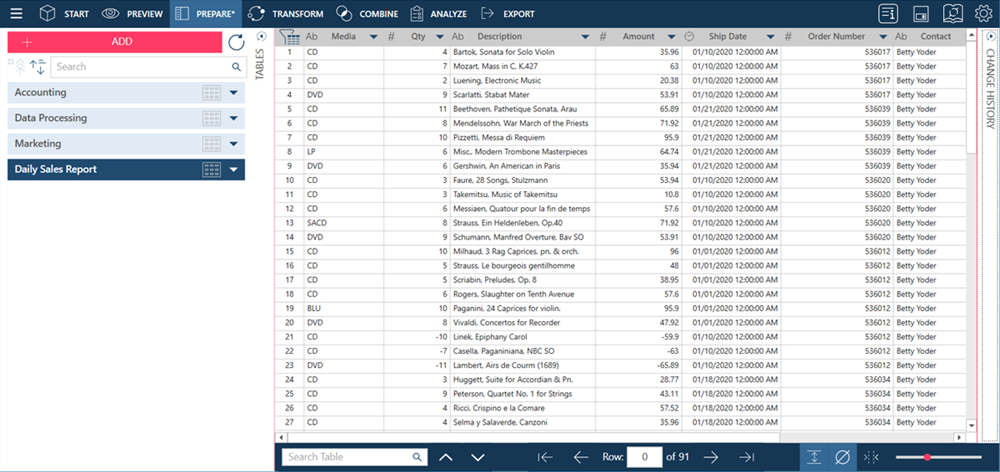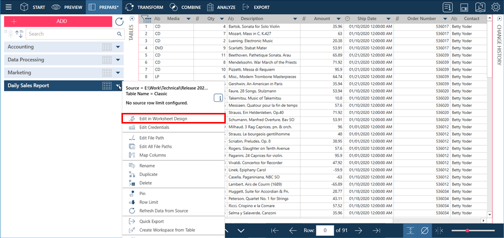 When you accept a template, data is extracted from the spreadsheet and displayed on the Prepare Window: