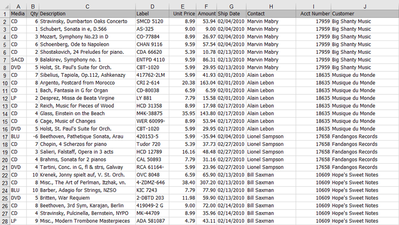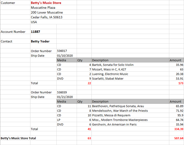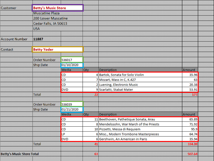 Customer is the highest sort level, followed by Contact, Order Number, and then Ship Date. The columns comprising the transactions are at the detail level.