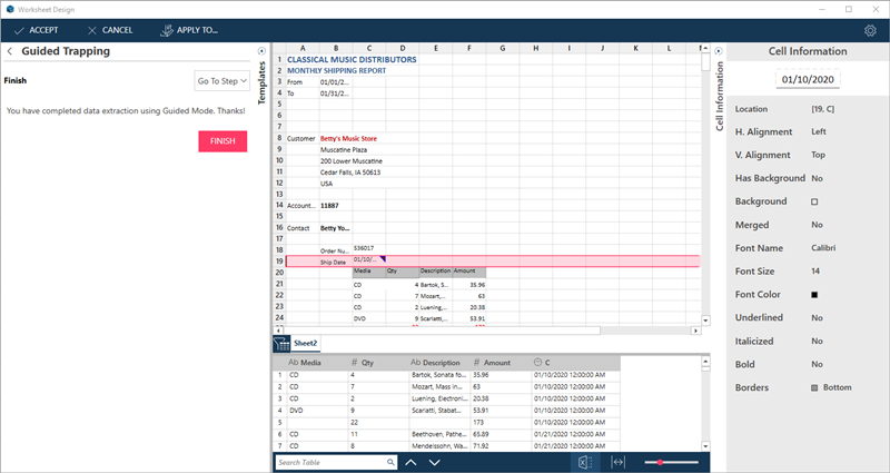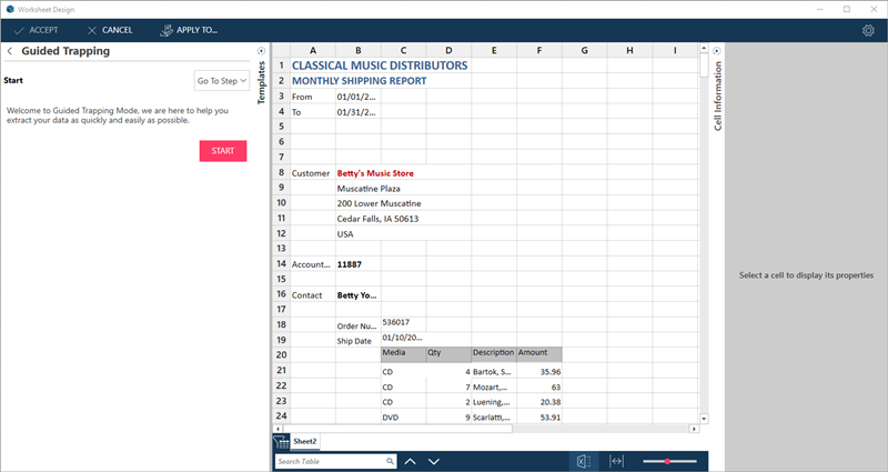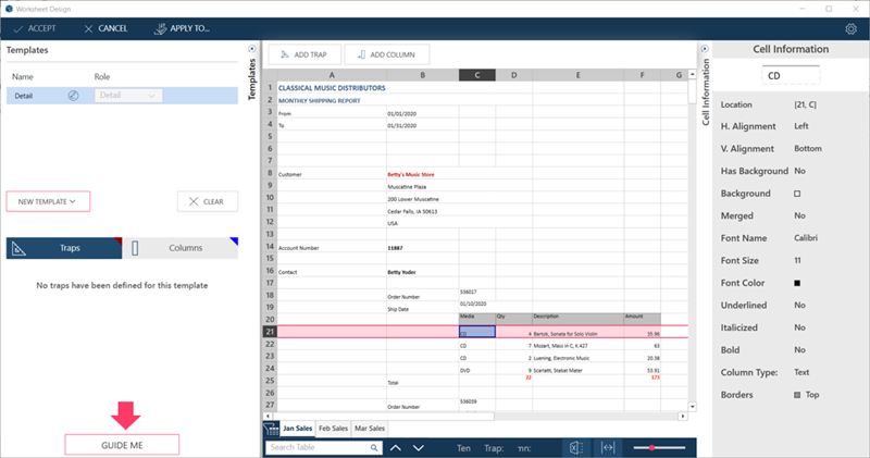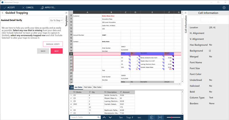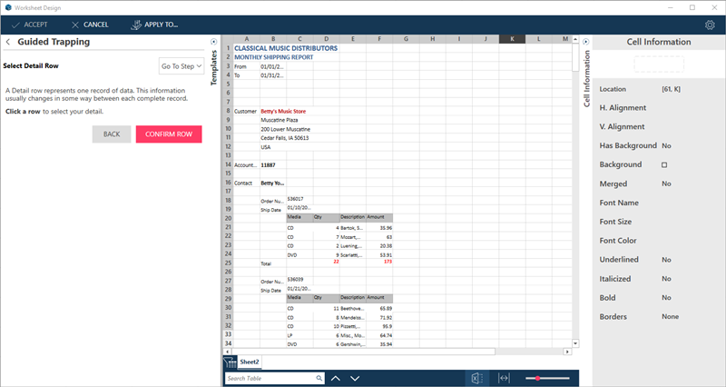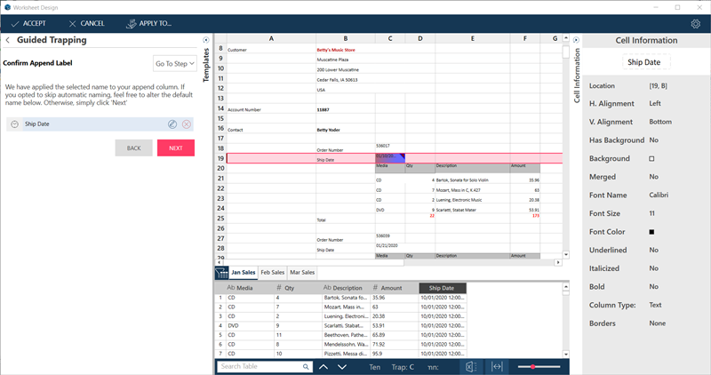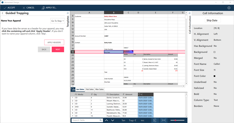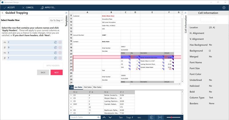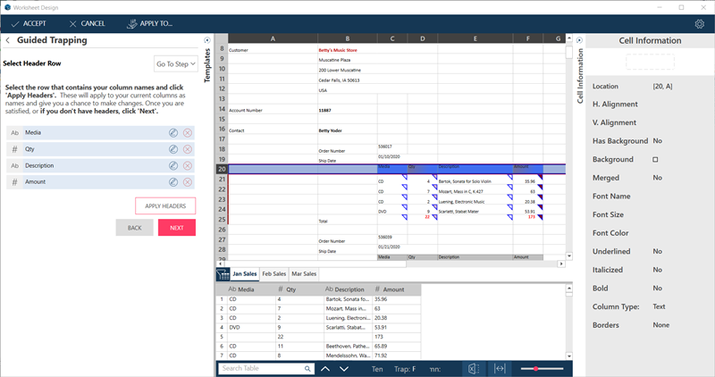 The Wizard automatically identifies the columns on the row you selected as trappable columns, and traps these. This is signified by the solid triangles at the top-right corner of the columns.