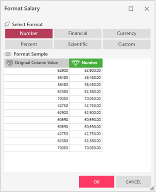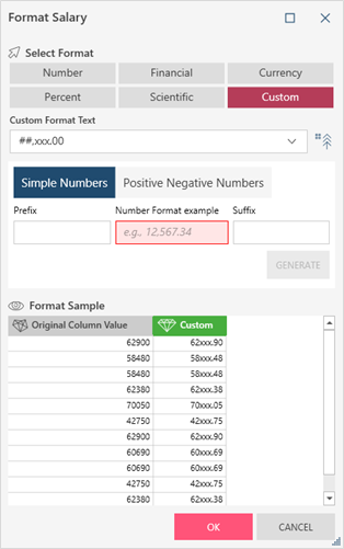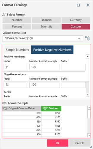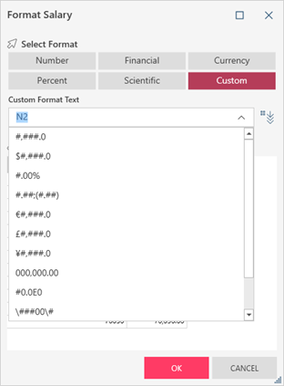 Select one of the pre-defined formats (Number, Financial, Currency, Percent, Scientific) to apply these formats to your numeric columns. Alternatively, select Custom to enter your own custom formatting: