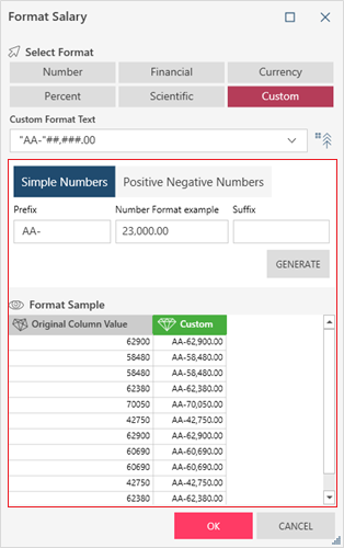 To format positive, negative, and zero numbers, ensure that the Positive Negative Numbers tab is selected and then specify a format example and desired prefix and/or suffix for positive, negative, and zero numbers. Click the Generate button to produce a sample of what your numbers will look like when your selected formatting is applied. Note that the Generate button is disabled when a custom format has not been specified for a specific number type (positive, negative, and zero) or when alpha or special characters are inputted in any of the Number Format example fields in this tab.