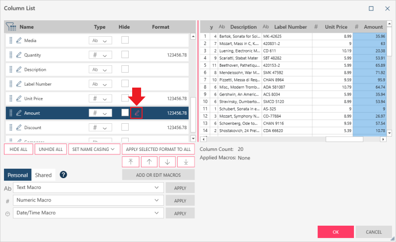 Select OK if you are satisfied with the new formatting. The Format dialog closes and you are returned to the Column List dialog.