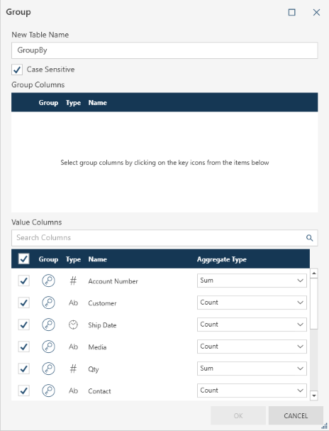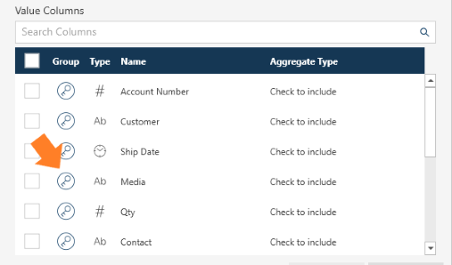 Select the columns to group on by selecting the key icon beside a column on the Value Columns section of the dialog box: