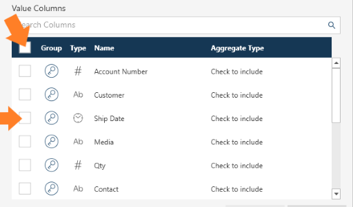 To select the specific columns to use as values, check the box beside a column.