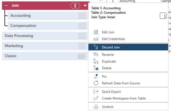 If you want to edit or discard the join, select the corresponding option from the drop-down beside the Join table: