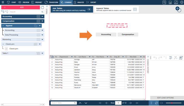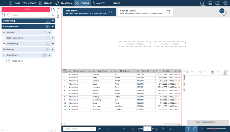After loading data into the Prepare Window, click Combine > Join to activate the Joining Stage.