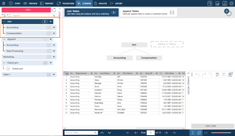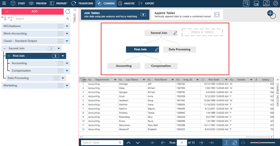 The Combine Stage allows you to create joins from two tables in a single join session. Join two or more tables if you want to combine records from each table into a more comprehensive table. Joins allow you to consolidate your data and enrich your view of the information they contain.