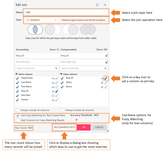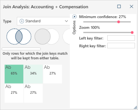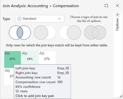 In this example, the mouse is hovered over the box marked 65%. The pop-up notifies you that using Emp_ID from the Accounting table and Emp_ID from the Compensation table will produce a 65% match.