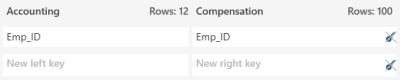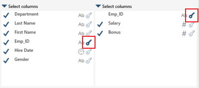 To select join keys, select the key icon on the left table with the matching key icon of the matching column in the right table: