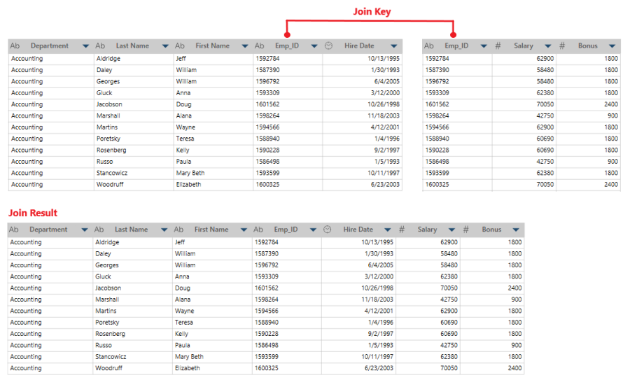 To illustrate the join types and operations below, consider the following examples: