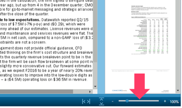Use the page zoom control, at the bottom right corner of the Document Panel, to zoom in or out of a specific area of the page: