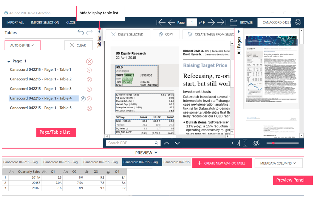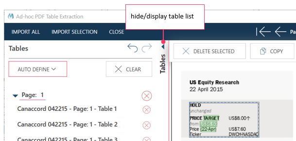PDF Table Extractor allows you to easily view tables that have been defined. Use the following to find, select, and display table values on the Table Panel: