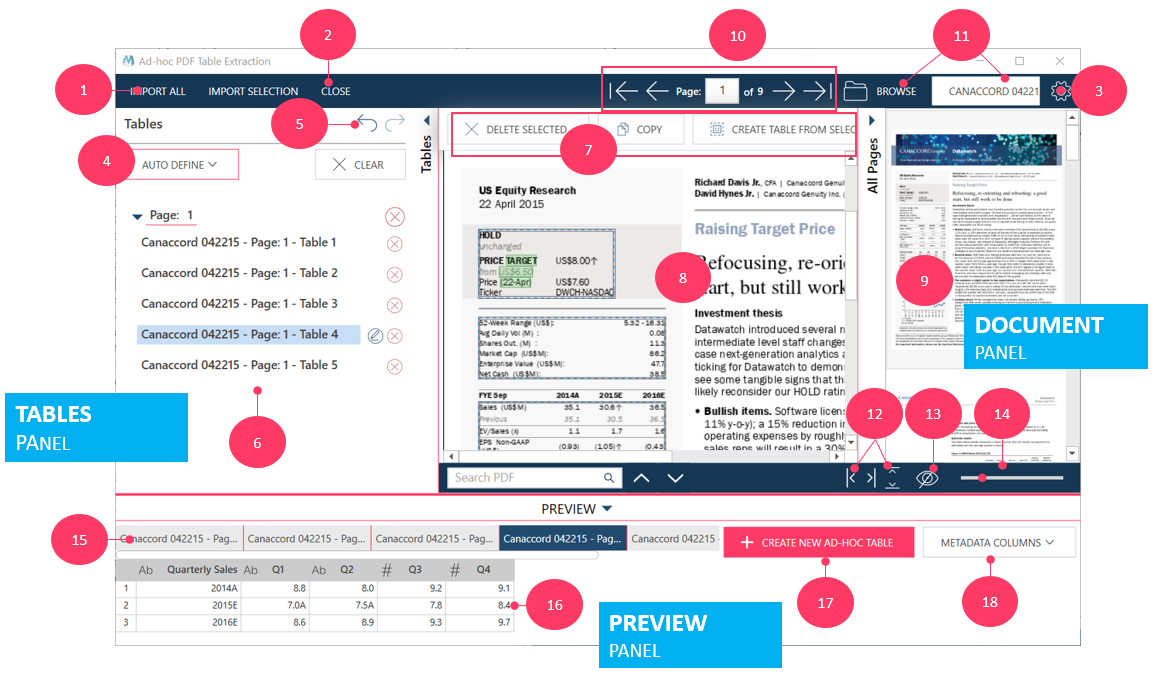 The PDF Table Extractor Interface has panels, windows, and icons that allow you to:
