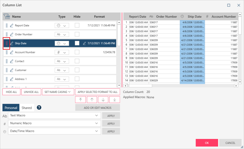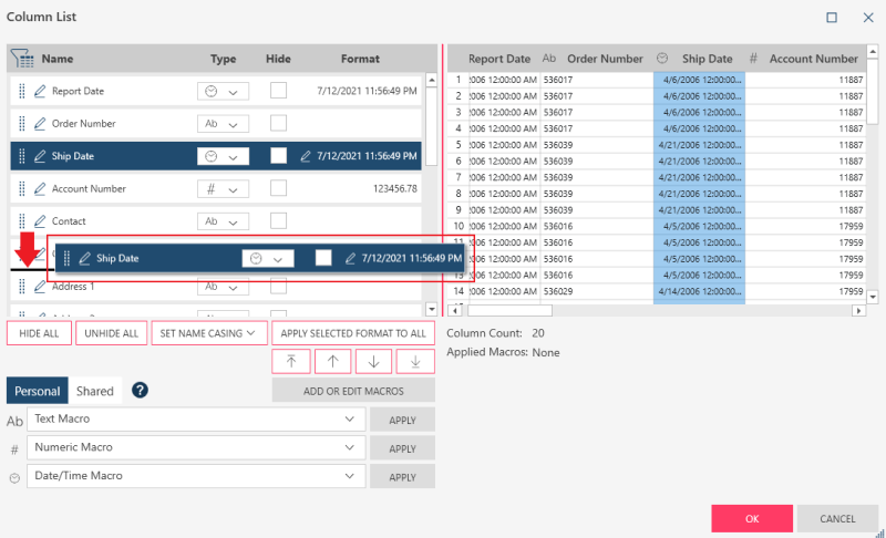 1. On the Prepare window, right click on a column and then select Column List from the context menu. The Column List dialog displays.
