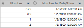 In this example, Number is the original column and Number to Date/Time shows the converted values.