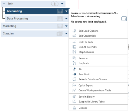 1. On the Prepare Window, click on the drop-down icon located to the right of the table you would like to refresh.