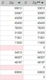 In this example, the original column is Zip. The Replace Null Values operation was used to remove the null values and replace with 0 to produce the resulting values in Zip**.