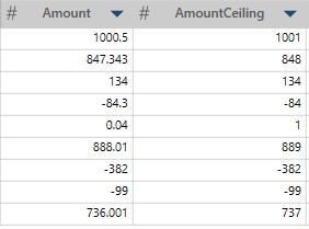 In this example, Amount is the original column. AmountCeiling is the result showing the ceiling values of Amount.