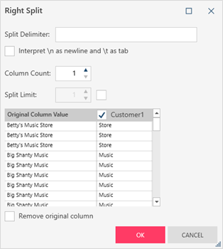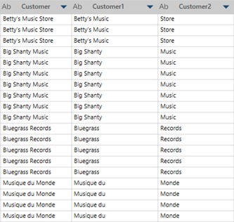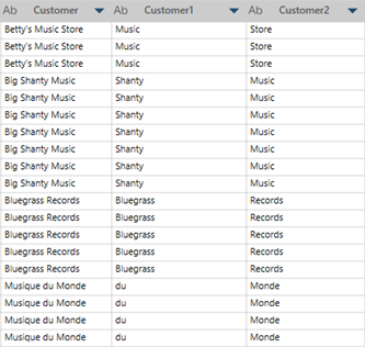 In this example, Customer is the original column. We split the column into 2 columns (i.e., Customer1 and Customer2) from the right using a space as the separator and a split limit of 2 (i.e., split the value at the first two occurrences of the delimiter). Note how, compared with the example above, the values in Customer 1 appear "truncated." If we had specified a column count of 3, the complete value of the Customer column would display over three columns. In this case, rows corresponding to Bluegrass Records will be empty in the first column (Customer 1).
