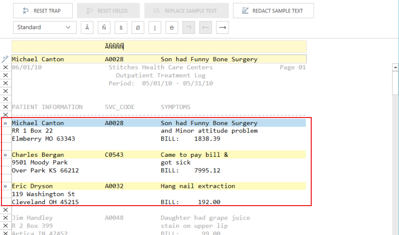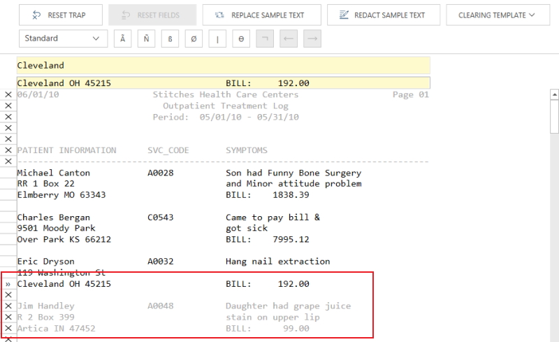 When a template, such as a detail template, is to be created after Start/End Region templates have been specified, only the section between the lines beginning with "Michael" and ending in "Cleveland" are available for possible trapping.