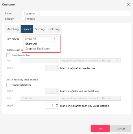 In the Layout tab, use the Key Values drop-down to select Suppress Duplicates.