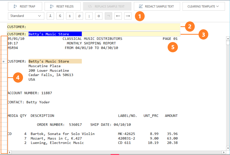 Allows you to define your trap. Position your cursor over a character in the sample line and then specify a trap to capture this character. Right-clicking anywhere on this line displays a menu that allows you to cut, copy, or paste text, delete the selection, or reset the trap. |