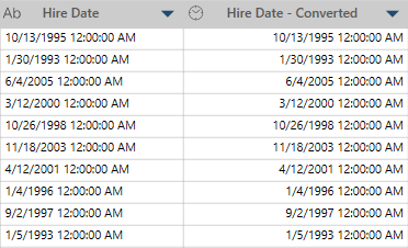 In this example, Hire Date is the original column and Hire Date - Converted shows the converted values.