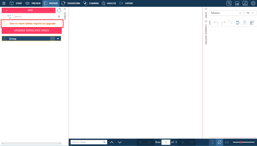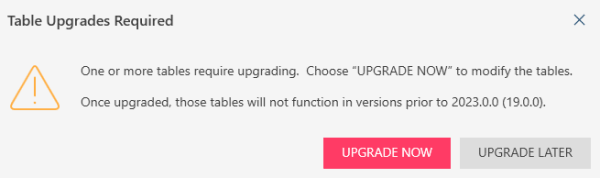 If you choose Upgrade Later, the workspace opens but the following warning displays in the table selector: