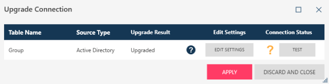 - If the upgrade result is Upgraded but the application has determined that the table requires an upgrade, click Edit Settings. The Datasource Connection dialog displays.