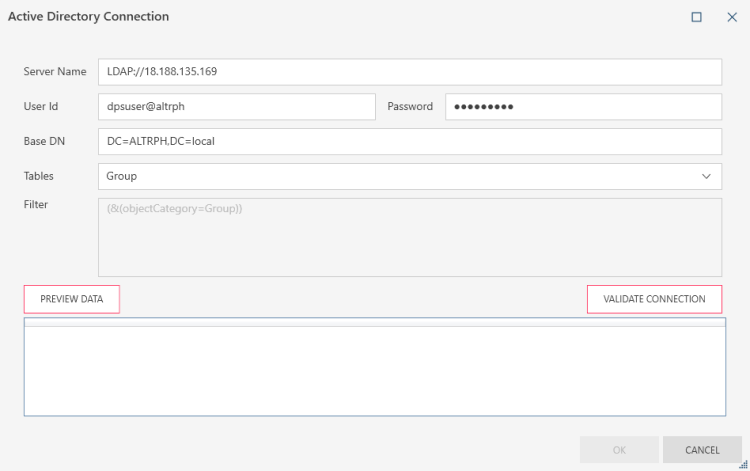 - Check that the connection settings and table name are correct. You can test the connection by clicking the Validate Connection button and preview the table by clicking Preview Data. Depending on the connector, you can also modify settings for Tables & Views and Query. Click OK when done.