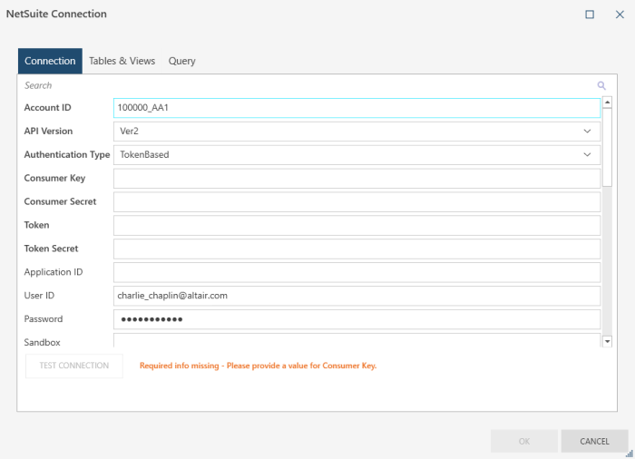 - Provide the missing information (i.e., all fields in bold). Messages at the bottom of the dialog will prompt for any missing information required by the connector. Note that if any required field is left blank, you will not be able to save the connection settings or test the connection. Depending on the connector, you can also modify settings for Tables & Views and Query.
