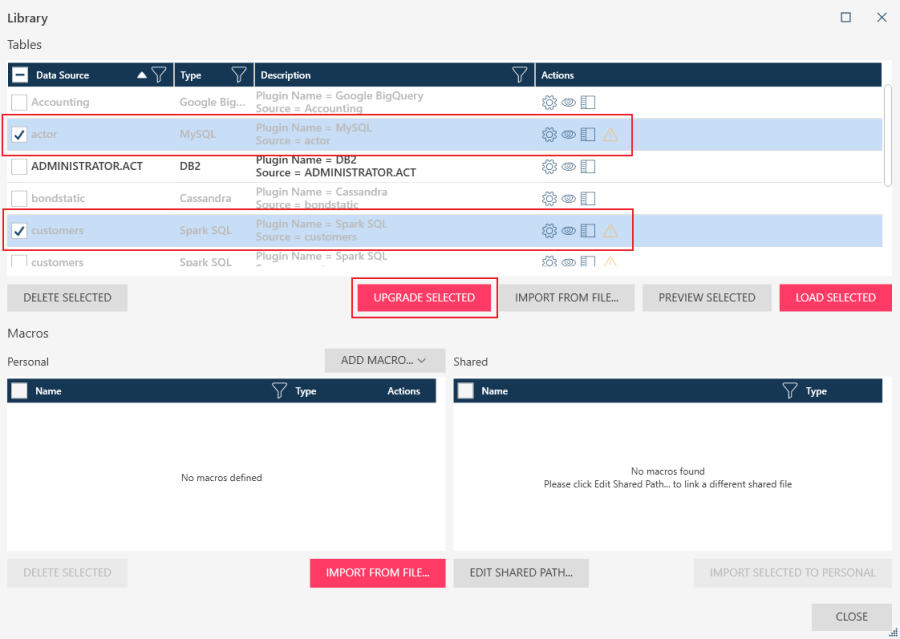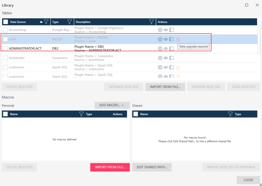 Several datasources available in previous versions of Monarch Data Prep Studio (i.e., versions 2022.1 and older) were deprecated in the 2023 version of the application and replaced with new ones. Thus, workspaces and library files containing tables obtained using older data connectors will not open properly unless these connectors are upgraded. You can perform either a manual upgrade of these deprecated tables as described below or a bulk upgrade using Monarch Utility.
