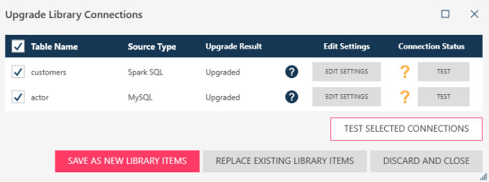 The Upgrade Library Connections dialog displays. This dialog contains information similar to that in the Upgrade Connections dialog.