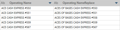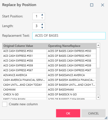 In this example, Operating Name is the original column. We substitute three characters starting from position 1 with the text "ACES OF BASES" to get the values in Operating NameReplace.