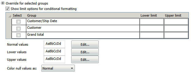 If you wish to define colors for conditional formatting, click Show limit options for conditional formatting. The screen will provide text boxes for entering the Lower and Upper limits for each group: