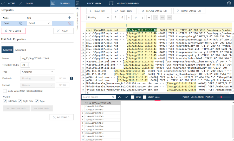 In reports such as this, a standard trap will not work. Fortunately, Monarch Data Prep Studio includes a special trap called the floating trap, which can successfully extract data from many log files, reports and HTML files in which the data placement is not rigidly fixed.